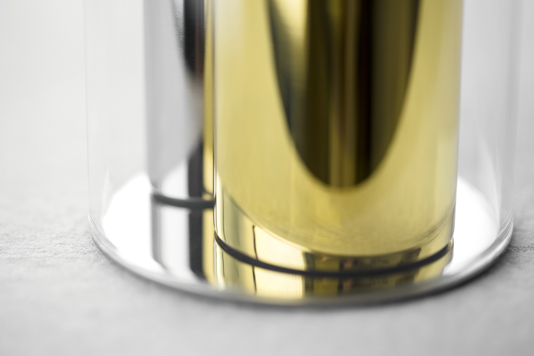 Penpo 是由三支尺寸各異,分別為玻璃、不鏽鋼和紅銅/黃銅管組成的 3 件式文具收納組,3個獨立收納筒可分開使用,也可透過底部隱藏的磁鐵設計,收納成一座錯落有致的桌上「微型建築」。