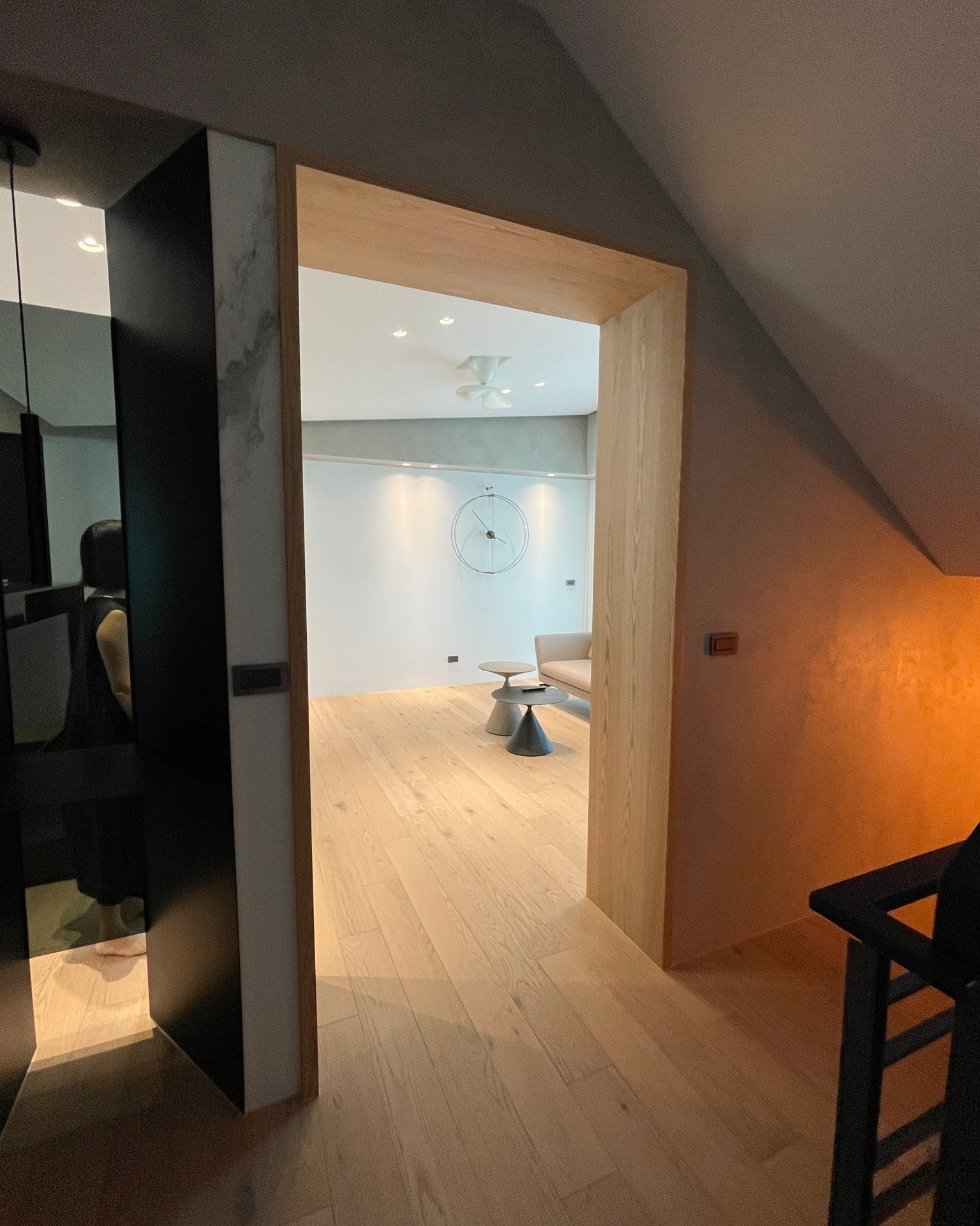 H小姐新家的客廳位於二樓,從樓梯玄關處向客廳看去,即可看到時鐘美麗的身影,若要說是刻意的安排也是對的,因為老書習慣在一個作品裡,花不少的時間在找空間與時鐘的甜蜜點(Sweet point),再次驗證我們家賣的不只是商品,而是你沒發現商品與空間裡的秘密。