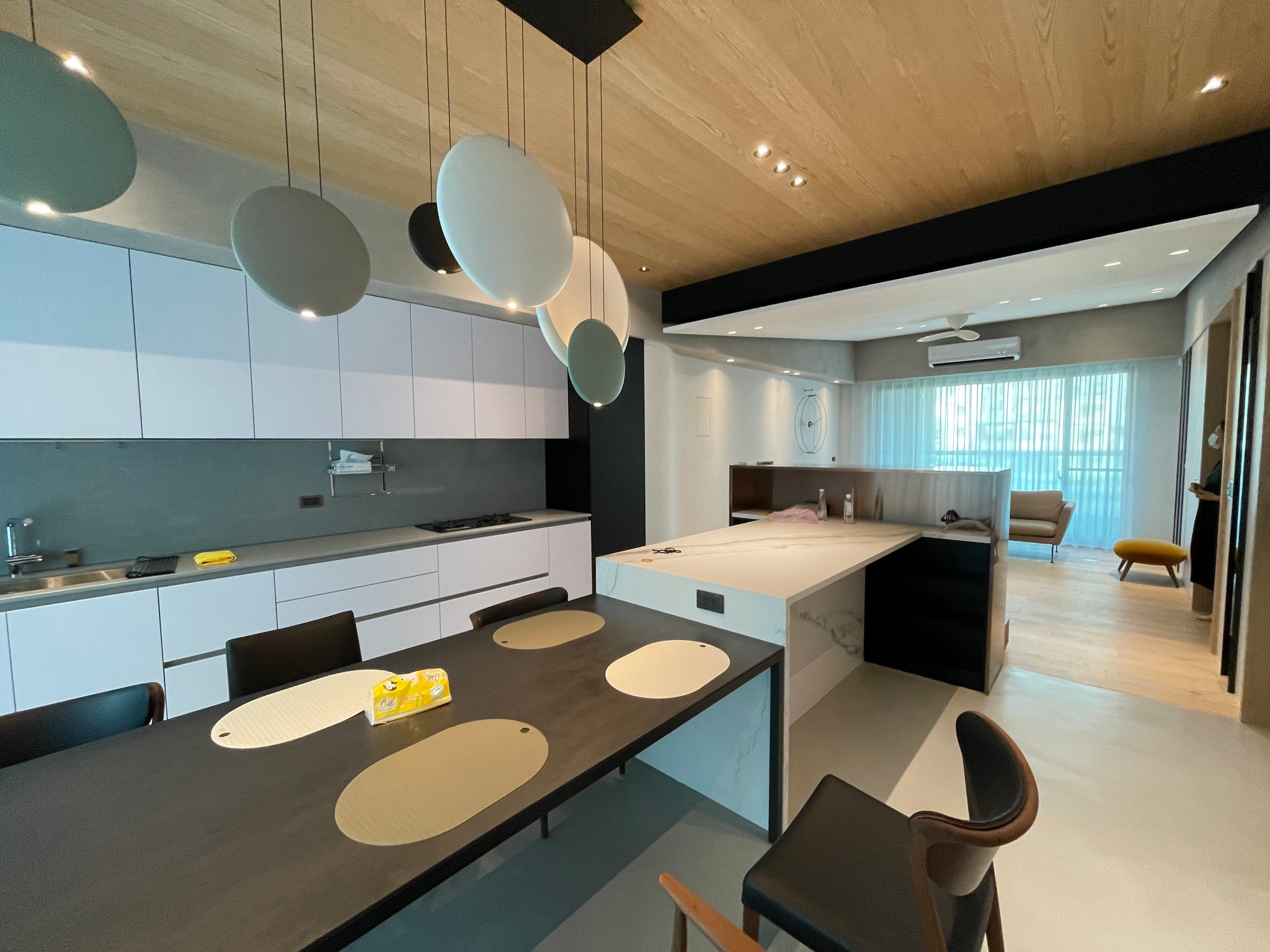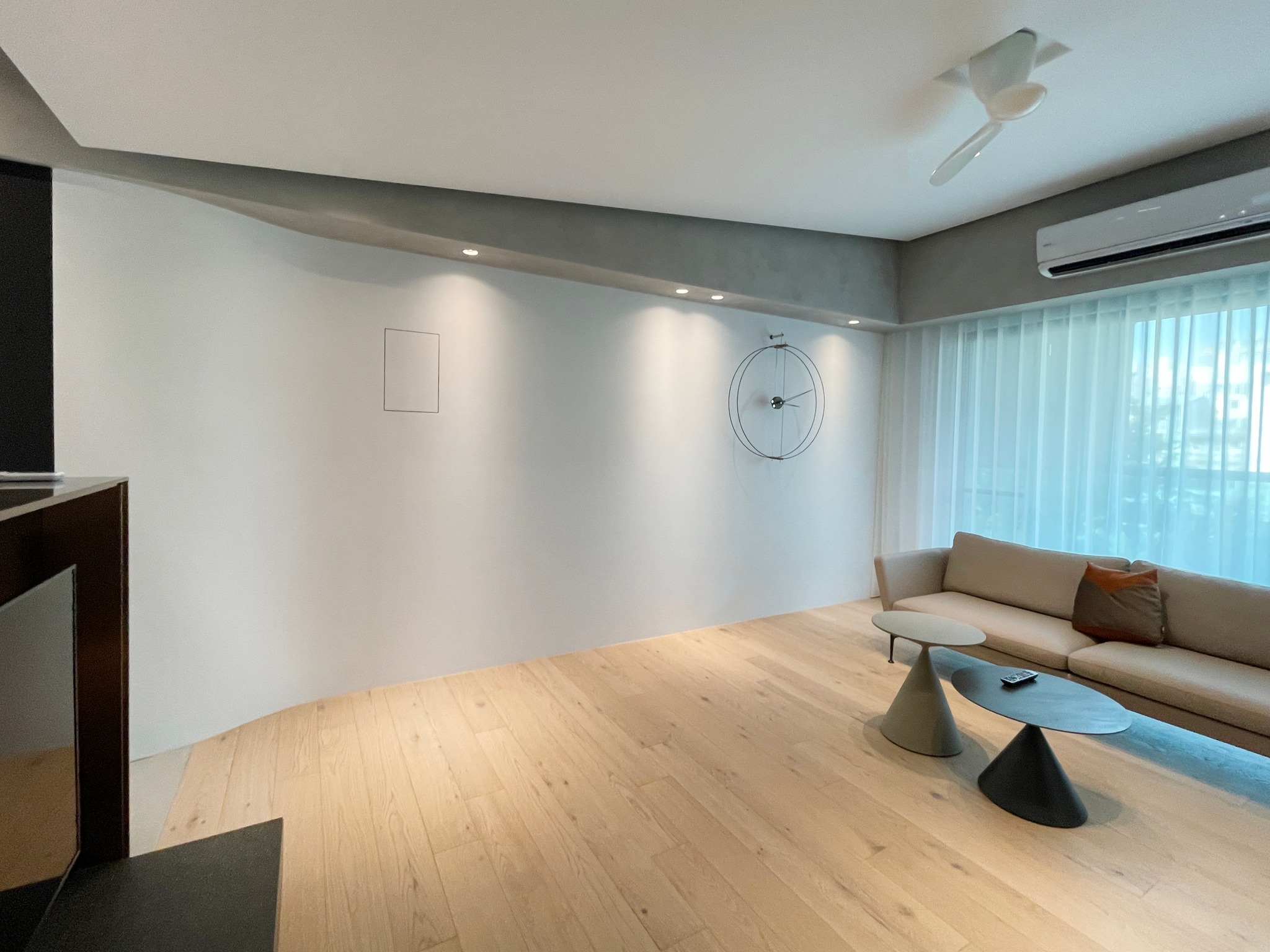 這次老書採用全新的工法及定位,主要是要讓時鐘的高度必須高於電視牆,好讓餐廳中島的空間也能掌握時間,因此時鐘的高度需要儘可能的拉高,不過老書這次刻意利用兩盏投射燈的中間,做為時鐘的定位有個重要的原因,是來自現場的自然光線及H小姐的生活習慣。