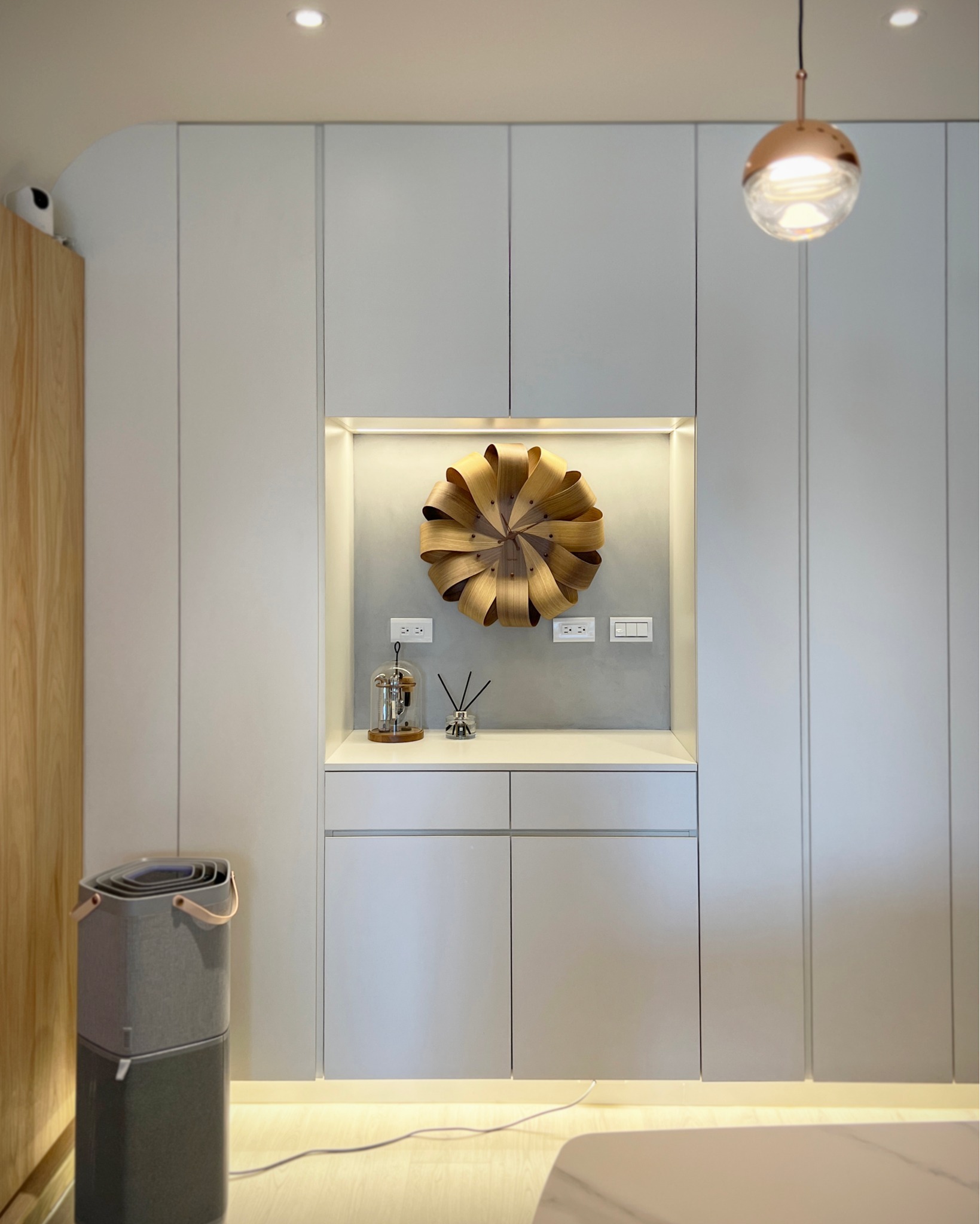是的,比較少有客戶會利用玄關櫃的位置放入時鐘,而且還是放在櫃子內的時鐘,換句話來講就是要將手工時鐘完美的融入櫃子內,如同時相框內的時鐘一樣的美麗,除此之外還得保留櫃內的原有功能:插座!