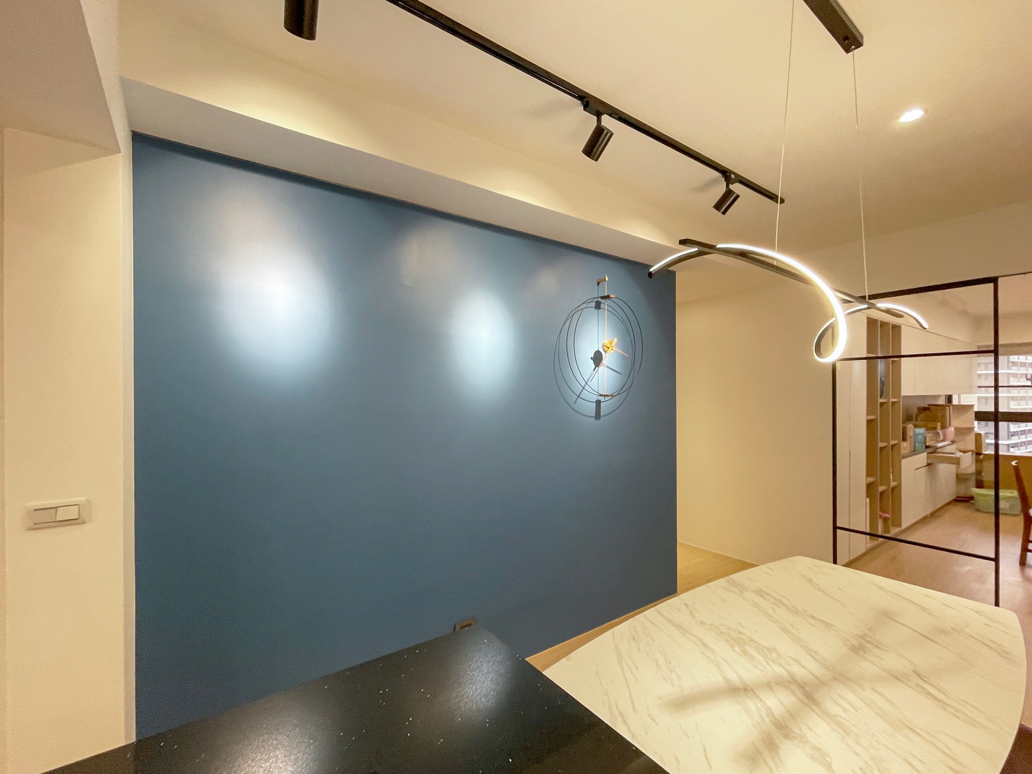 這個部份即是C小姐特別要請老書出馬的原因,因為投射燈距時鐘前方的角度、距離及色溫都是老書親自研究後的結果,主要的目的就是要讓金色的時鐘與藍色的牆面有最溫暖的連結與融入。