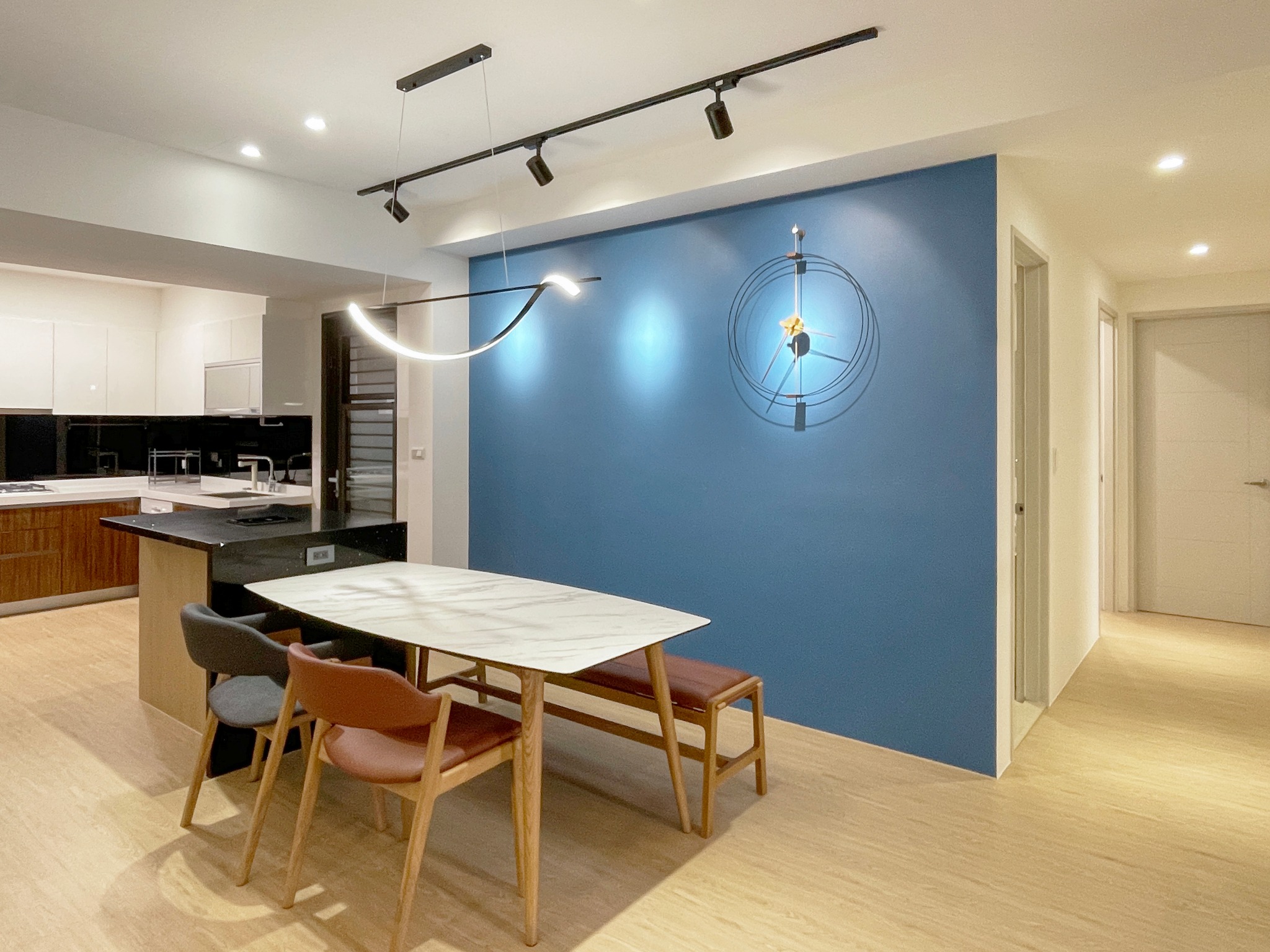 C小姐是在我們粉專潛水很久粉絲,而期待很久的新家入手後即透過我們的line客服與我們聯絡,特別挑選全家每天都會相聚的晚餐時段與空間,並且挑選深藍色的特殊顏色(可讓塗料師傅忙了),以及來自西班牙手工時鐘的mini Barcelona 金色時鐘,接下來就有勞我們家老書的專業來成就這幅完美的作品了。