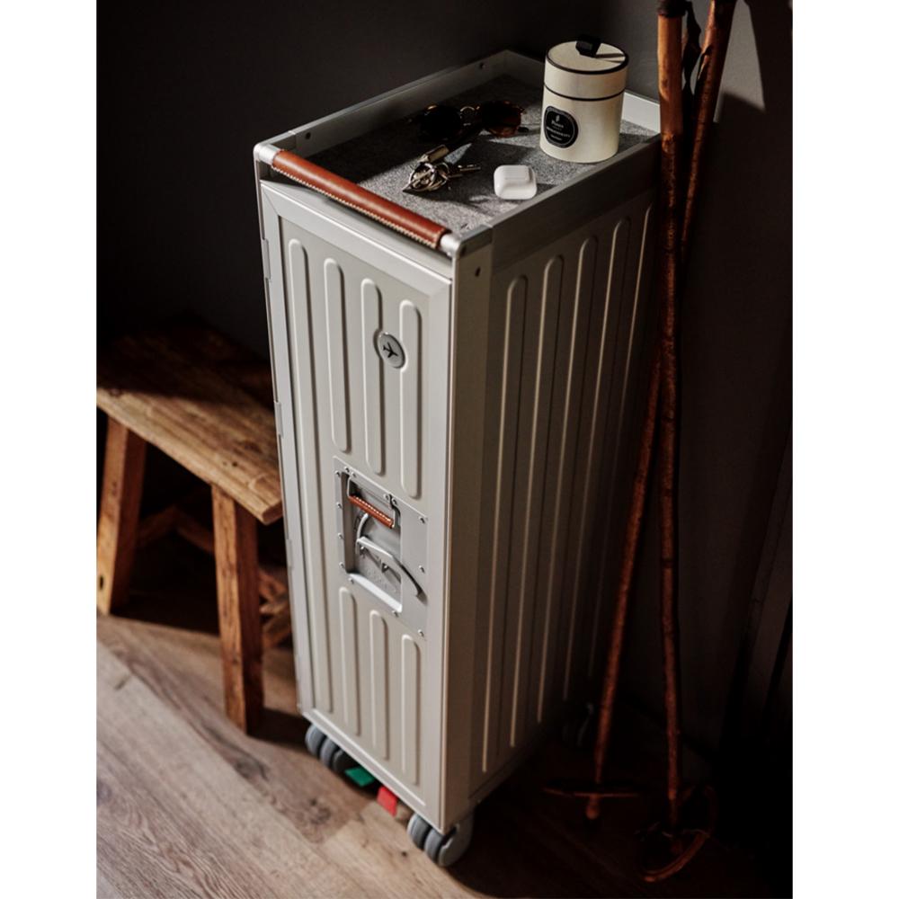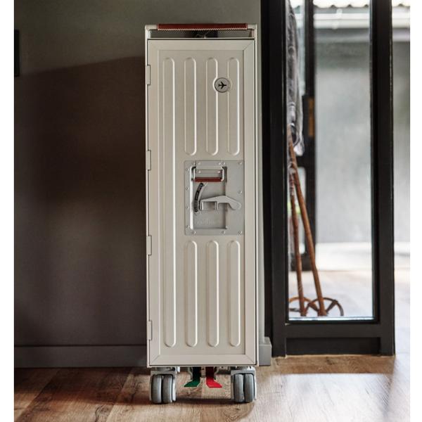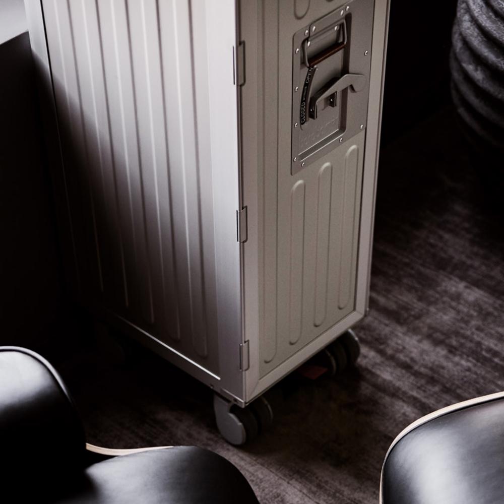 Bordbar機艙推車可說是一款多功能的儲存空間,靈感來自工程奇蹟結合航空旅行的浪漫。這款特別版機艙推車具有工業風格的溝槽鋁面板,手工縫製的皮革覆蓋把手,使其外觀優雅精緻。