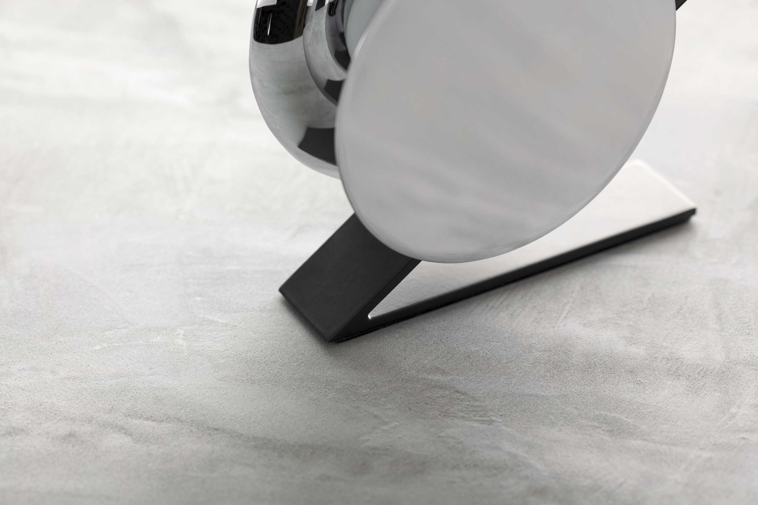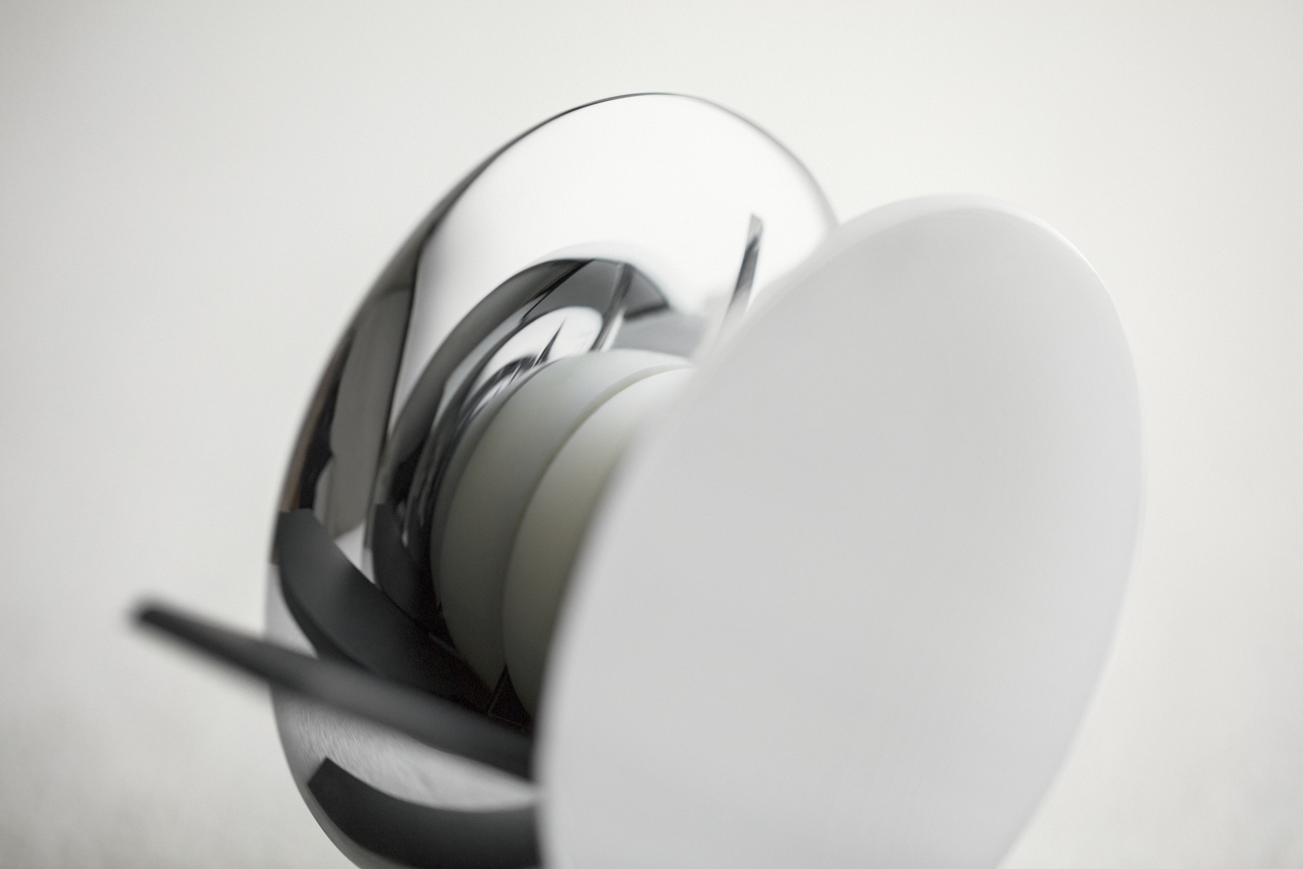 為了讓膠台穩定不晃動且可單手使用,此設計構造上的金屬質量極高,但透過鏡面圓盤內縮曲線的巧妙設計,視覺上卻輕盈無比,實現高反差的對比巧思。特別是圓盤微妙的內凹曲面在拋光工藝上可說是極大的挑戰,於設計團隊的堅持下耗時九個月開發,終於呈現出毫無妥協的設計。